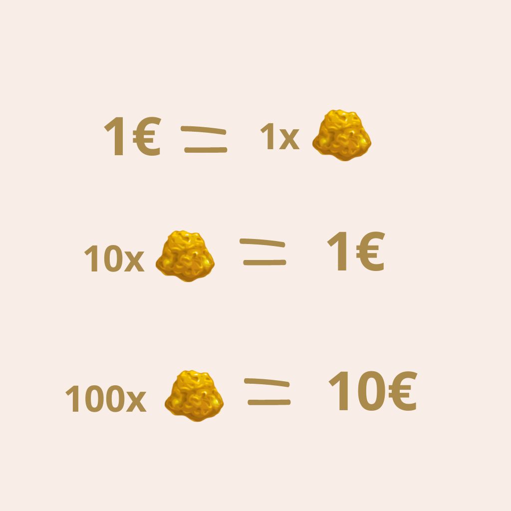 Par exemple, si vous effectuez un achat de 100 euros dans notre boutique, vous accumulerez 100 pépites, que vous pourrez utiliser pour une réduction de 10 euros lors d’un prochain achat.