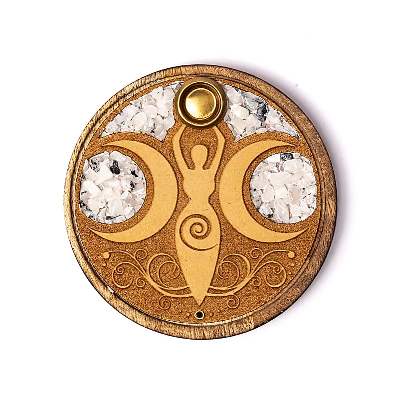 Queimador de incenso com decoração de deusa da lua, enriquecido com pedra da lua arco-íris.
